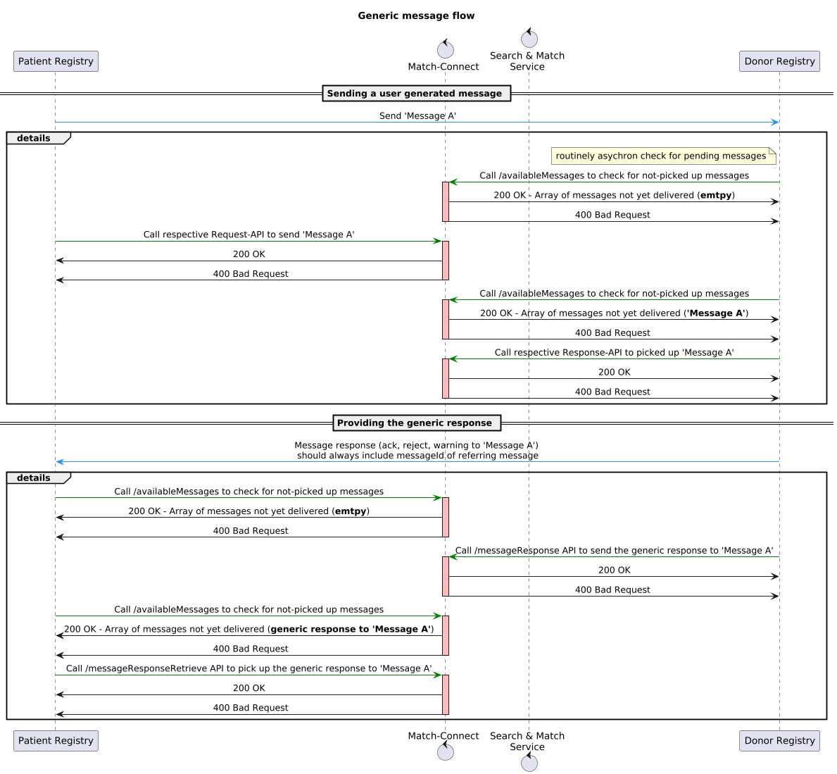 For all user generated connect messages from a patient registry to a donor registry or vice versa the generic message flow consists of the message sent (e.g. a Sample Request) and a corresponding Message Response (6.2). The detailed message flow for such a message including the generic response message is shown below. The generic response message will be ommited in request message flows in chapter 5, for better readability.