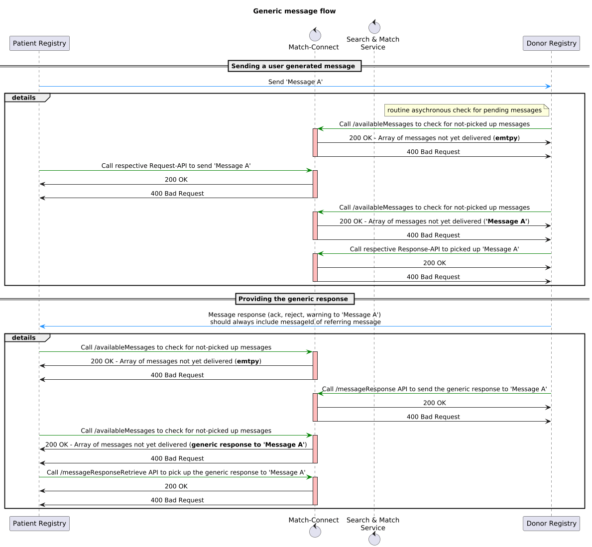 For all user generated connect messages from a patient registry to a donor registry or vice versa the generic message flow consists of the message sent (e.g. a Sample Request) and a corresponding Message Response (6.2). The detailed message flow for such a message including the generic response message is shown below. The generic response message will be omitted in request message flows in chapter 5, for better readability.