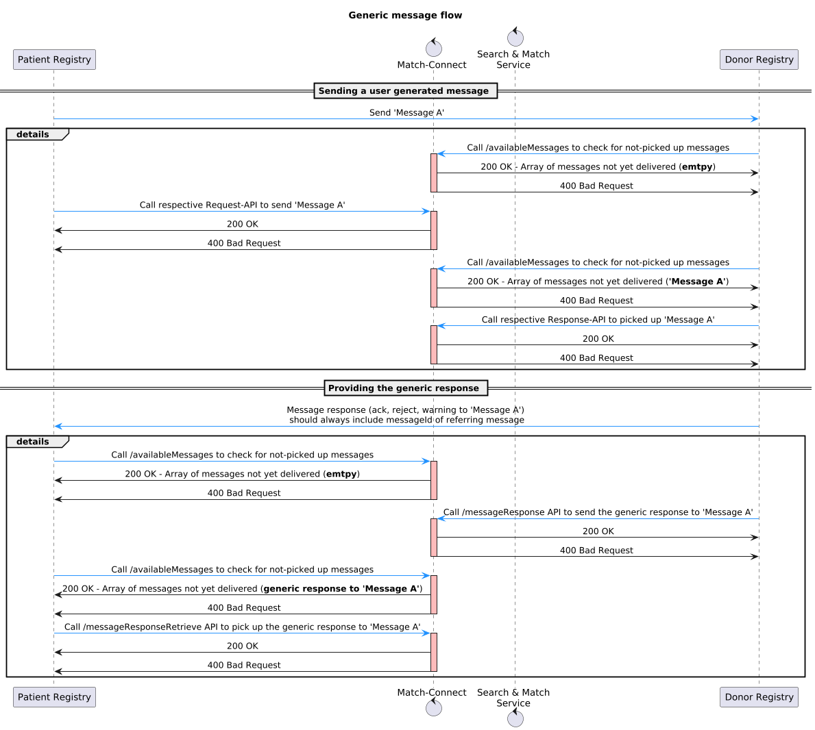 For all user generated connect messages from a patient registry to an donor registry or vice versa the generic message flow consists of the message sent (e.g. a Sample Request) and a corresponding message response (6.2). The detailed message flow for such a message plus generic answer is shown below. The generic response message will be ommited in request message flows in chapter 5, for better readability.