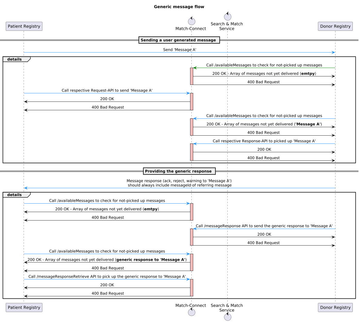 For all user generated connect messages from a patient registry to an donor registry or vice versa the generic message flow consists of the message sent (e.g. a Sample Request) and a corresponding message response (6.2). The detailed message flow for such a message plus generic answer is shown below. The generic response message will be ommited in request message flows in chapter 5, for better readability.