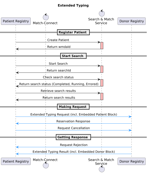 - All changes in the donors (change of status, updated typing, or IDMs) resulting from the requests are reported back in an Embedded Donor Block within the respective message, e.g. updated HLA information resulting from a Extended Typing Request in a Extended Typing Result. A separate update must be made to the Search & Match system with the updated donor data to ensure up-to-date master data. More information on how to do so may be found here.
